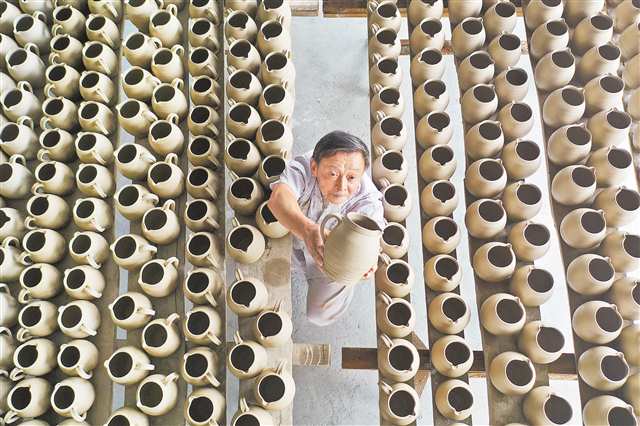 9月14日,黔江區(qū)濯水鎮(zhèn)石雞砣土陶非遺工坊,傳承人劉沛良在檢查茶罐陶坯質(zhì)量。 黔江區(qū)濯水鎮(zhèn)石雞砣土陶制作技藝有1000多年的歷史,是重慶市非物質(zhì)文化遺產(chǎn)代表性項(xiàng)目?!?/p>