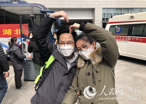 “這次去支援湖北,不僅是履行醫(yī)生的職責(zé),對(duì)自己也是一種鍛煉。”重慶市人民醫(yī)院兩江新區(qū)院區(qū)急診科住院醫(yī)師李耿說(shuō)。在重慶北站,李耿和來(lái)送行的妻子侯爵留下了一張“比心”的合影。“我和肚子里的寶寶等你平安歸來(lái)!焙罹舯е罟⒄f(shuō)。