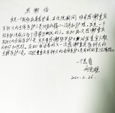 何叔叔,我也要感謝您,感謝您對我們治療工作的肯定與配合,感謝您像關心女兒一樣的關心我,感謝您給我留下的感動,感謝您為其他病友加油打氣。何叔叔,武漢和重慶隔著800多公里的距離,我們相聚在這里就是緣分,我相信,這只是我們緣分的開始,我們一定會有摘掉口罩,笑臉相對的某一天。(整理:陳琦、劉祎、尹蕾)