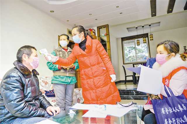2月2日,在兩江新區(qū)人和街道邢家橋社區(qū),社區(qū)黨委書記謝蘭(右二)和網(wǎng)格員李麗娟上門為居民測體溫,同時拉家常為他們排解焦慮。