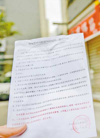 1月24日,在兩江新區(qū)人和街道,社區(qū)工作人員正在挨家挨戶張貼自制的《致社區(qū)居民的一封公開信》,進行防疫宣傳。