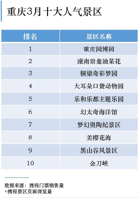 數(shù)據(jù)顯示,3月重慶人氣最高的十大景區(qū)分別是重慶園博園、潼南崇龕油菜花、銅梁奇彩夢(mèng)園、大耳朵口袋動(dòng)物園、樂和樂都主題樂園、幻太奇海洋館、夢(mèng)幻奧陶紀(jì)景區(qū)、美櫻花海、黑山谷風(fēng)景區(qū)和金刀峽。