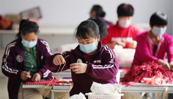 4月8日,在泰來縣平洋鎮(zhèn)雙山村扶貧車間,女工們在編織汽車坐墊。 眼下,黑龍江省泰來縣已復(fù)工復(fù)產(chǎn)的扶貧車間正開足馬力,趕制產(chǎn)品訂單。去年以來,泰來縣扶持各鄉(xiāng)鎮(zhèn)把汽車坐墊編織等扶貧車間建立在村屯,依托縣里引進的龍頭企業(yè)帶動,讓群眾在家門口實現(xiàn)就業(yè)增收。截至目前,全縣已建立27個扶貧車間,帶動1200余人就業(yè)增收,其中貧困群眾200余人。 新華社記者 王建威 攝