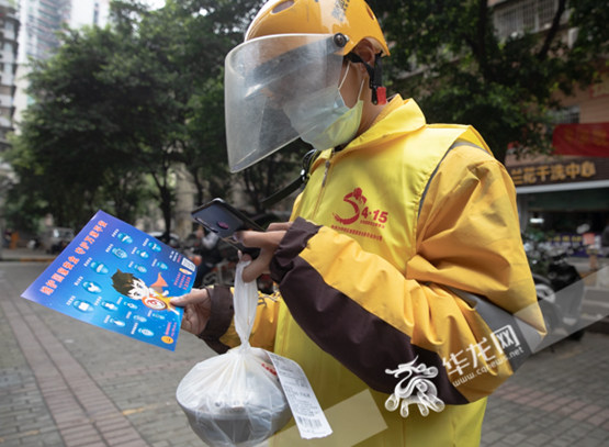 “請關(guān)注全民國家安全教育日,您可以掃一掃上面的二維碼,還可以搶紅包哦!”中午12點(diǎn)過,沙坪壩土灣的住戶劉先生接過送來的午餐后,外賣小哥也將宣傳制品遞了過來。劉先生告訴記者,以往各種宣傳日的活動,都是政府相關(guān)部門在各大商圈舉行,而這樣的“送貨上門”服務(wù),既是創(chuàng)新,也很貼心。