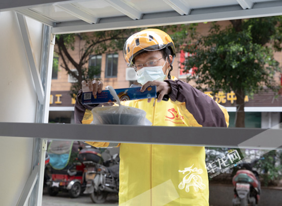 騎手將全民國家安全教育日的活動資料和餐食一起送到無接觸取餐點(diǎn)上。華龍網(wǎng)新重慶客戶端記者 張質(zhì) 攝