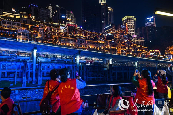 疫情防控一線工作者乘坐交運(yùn)兩江游船觀賞重慶夜景。鄒樂(lè) 攝