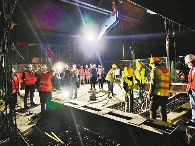 5月1日凌晨,施工人員奮戰(zhàn)在大橋連續(xù)梁合龍施工現(xiàn)場(chǎng)。(中鐵十五局重慶鐵路樞紐東環(huán)線項(xiàng)目部供圖)
