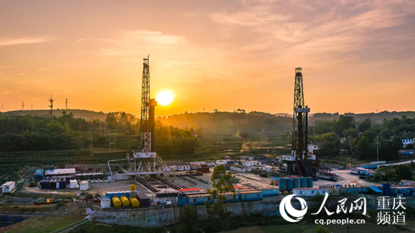 中國(guó)石化江漢油田涪陵頁(yè)巖氣田焦頁(yè)10號(hào)平臺(tái),雙鉆機(jī)沐浴在初升的陽(yáng)光下,正開足馬力向地層深處鉆進(jìn)。向陽(yáng) 攝