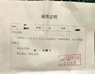 另一方面,到醫(yī)院開具整形證明有嚴(yán)格流程,必須經(jīng)過院方比對,并調(diào)取手術(shù)記錄查證本人后才能辦理。在醫(yī)學(xué)證明上,會有開具證明的人的基本信息,以及在醫(yī)院手術(shù)的時間和手術(shù)具體內(nèi)容信息等基本資料。