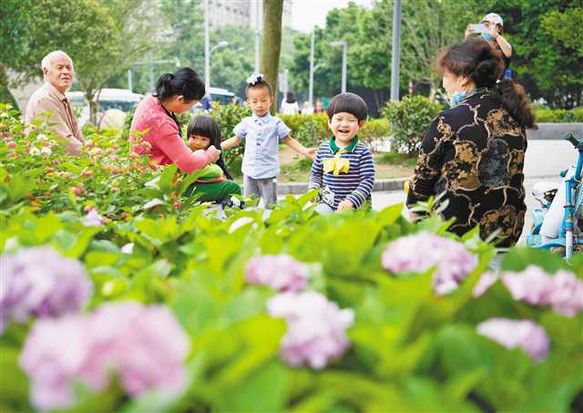 五月二十七日,北碚斑竹村游園,家長帶著孩子在花臺前玩耍。記者 謝智強(qiáng) 攝/視覺重慶