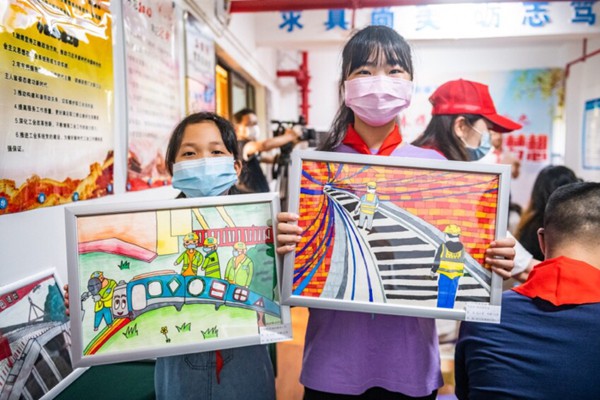 圖說:學(xué)生們用畫筆畫出的重慶軌道交通建設(shè)者。鄒樂攝