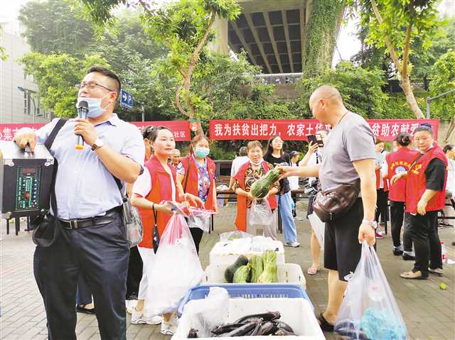 “農(nóng)家土貨來(lái)趕集,請(qǐng)為扶貧出把力!敝抑萁值厘\鴻社區(qū)的“愛(ài)心集市”設(shè)在長(zhǎng)江大橋下。來(lái)自石寶鎮(zhèn)太平村的黨支部書(shū)記袁亮身挎音響、手拿話筒,正賣(mài)力吆喝:“買(mǎi)茄子南瓜嘍!貧困村貨真價(jià)實(shí)的農(nóng)產(chǎn)品!”