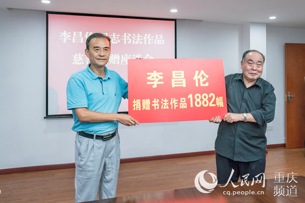 人民網(wǎng)重慶6月16日電(胡虹)6月15日、 70歲愛(ài)心書(shū)法家李昌倫將一生積攢的1882件自創(chuàng)作品(其中已裝裱70幅,未裝裱1812幅),全部無(wú)償捐贈(zèng)給重慶市慈善總會(huì),用于社會(huì)慈善事業(yè)。
