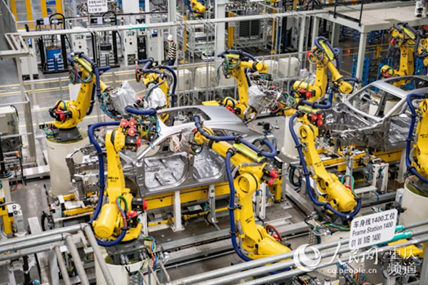 金康賽力斯兩江智能工廠,智能機器人在生產(chǎn)汽車。鄒樂攝