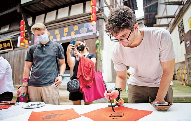 6月24日,巴南區(qū)豐盛古鎮(zhèn),外國友人正在體驗書法。記者 謝智強 攝/視覺重慶