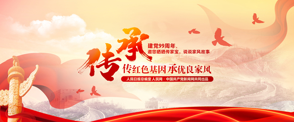 家是最小國,國是千萬家。我們即將迎來建黨99周年,99年時光,沉淀在小家里,是幾代人的記憶,融匯到時代中,是一個民族的前行。為此,人民日報政治版、文化版與人民網(wǎng)·中國共產(chǎn)黨新聞網(wǎng)聯(lián)合推出“傳承99·家風(fēng)久久”故事征集活動,邀請您曬曬紅色傳家寶,說說家風(fēng)故事,在紅色基因中汲取前進的力量,激發(fā)不渝意志、必勝信心、苦干動力,擔(dān)起時代使命。
