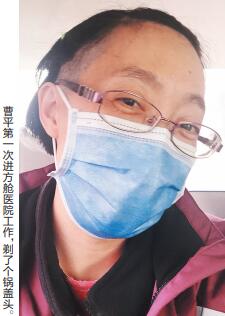 第二天,曹平接到武漢客廳方艙醫(yī)院工作人員的電話,需要她臨時(shí)加班。曹平剪掉了自己的卷發(fā),剃了個(gè)“鍋蓋頭”!按┥夏虿粷,堅(jiān)定無畏出發(fā)了!