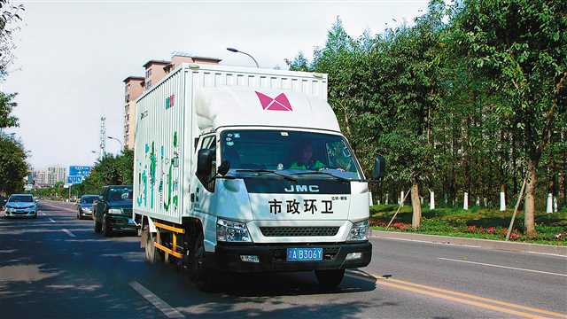 11∶47 回收轉運。收運車離開鋼球小區(qū),返回陳庹路中轉站分選中心。(市環(huán)衛(wèi)集團供圖)