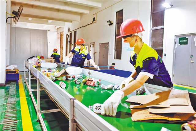 記者看到,分選中心的工人戴著口罩和手套,先是將一個個塑料袋里的各種可回收垃圾放到傳送帶上,然后傳送到分揀作業(yè)區(qū),工人分別揀出塑料飲料瓶、金屬易拉罐、廢紙板、紡織物等,放到身邊的藍色回收箱內。