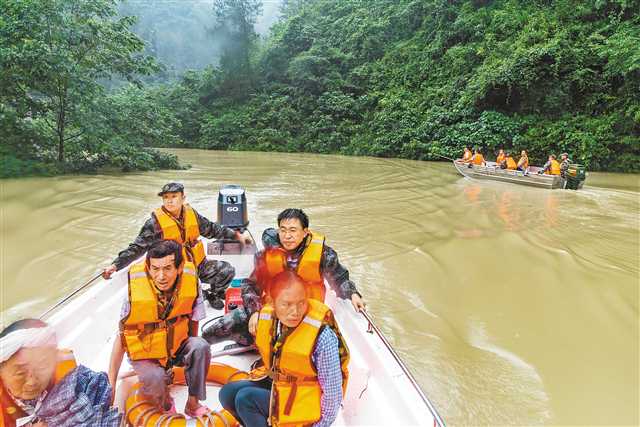 豐都 豐都縣暨龍鎮(zhèn)烏羊壩,縣民兵應急連組織兩艘沖鋒舟救援被洪水圍困的群眾。通訊員 林登周 攝/視覺重慶