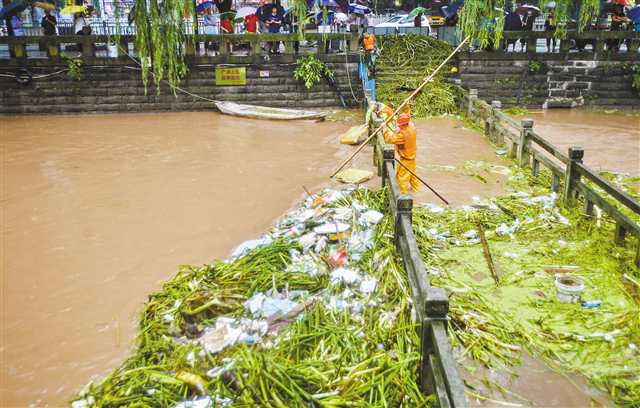 榮昌 榮昌區(qū)池水河,搶險人員正在清理河中的雜物垃圾,保證橋梁的安全。記者 龍帆 攝/視覺重慶