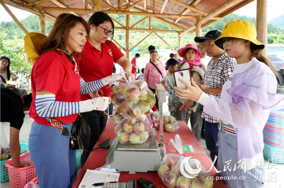 村民在指導(dǎo)游客採(cǎi)摘成熟的蘋果桃。何良樹攝