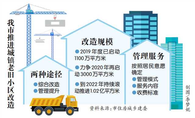 我市將在基本完成2019年度已啟動1100萬平方米改造提升任務的同時,力爭2020年再啟動3000萬平方米。到2022年,形成更加完善的長效工作機制和制度政策體系,按照“實施一批、謀劃一批、儲備一批”的原則,有計劃持續(xù)滾動推進全市1.02億平方米改造提升任務全面實施。