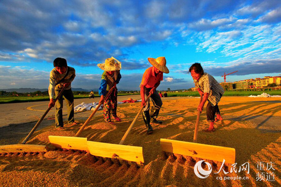 村民在重慶市墊江縣沙坪鎮(zhèn)畢橋村高標準農(nóng)田水稻基地用農(nóng)機收割水稻。龔長浩攝
