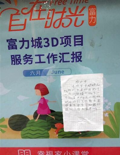 “各位爺爺、奶奶、叔叔、阿yi大家好,我犯了一個(gè)cuo。”這幾天,高新區(qū)一小區(qū)的告示欄里,貼出了一個(gè)孩子的檢討書(shū),檢討書(shū)里還有不少拼音,孩子寫(xiě)道:“我往樓下reng了個(gè)kuang泉水ping子,一位奶奶bei嚇到了……”