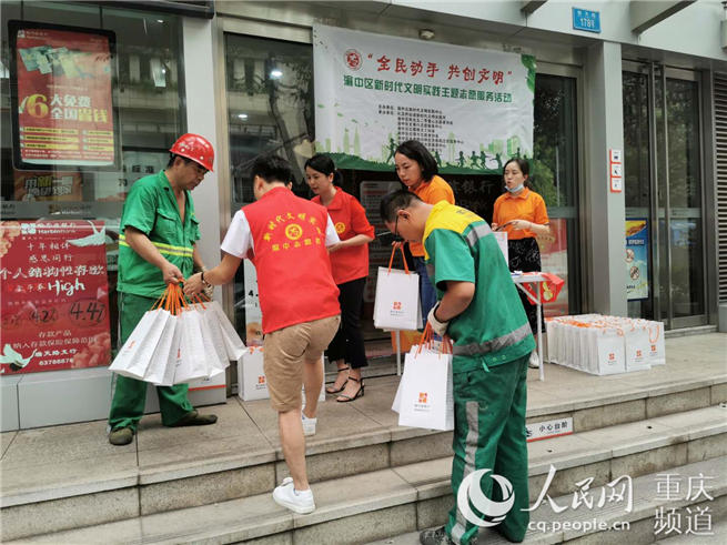 志愿者慰問高溫期間一線工作者。渝中區(qū)委宣傳部供圖