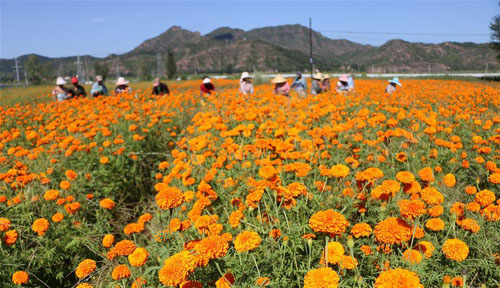 8月10日,農(nóng)民在承德縣六溝鎮(zhèn)前五溝村萬壽菊種植基地里采收萬壽菊。 近年來,河北省承德縣為推動(dòng)產(chǎn)業(yè)精準(zhǔn)扶貧,采取以“公司+基地+農(nóng)戶”的模式,發(fā)展萬壽菊種植產(chǎn)業(yè),帶動(dòng)農(nóng)民增收致富。萬壽菊的花朵是天然葉黃素的主要原料,目前,全縣萬壽菊種植面積約1.7萬畝。 新華社發(fā)(劉環(huán)宇攝)