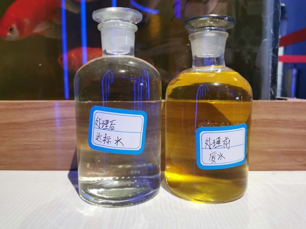 18日,在位于潼南高新區(qū)的“園中園”重慶巨科環(huán)保電鍍工業(yè)園內(nèi),工人們正在對(duì)工業(yè)廢水進(jìn)行無害化處理,一瓶橙黃色的有害廢水不多時(shí)便變成了可養(yǎng)魚的干凈水。
