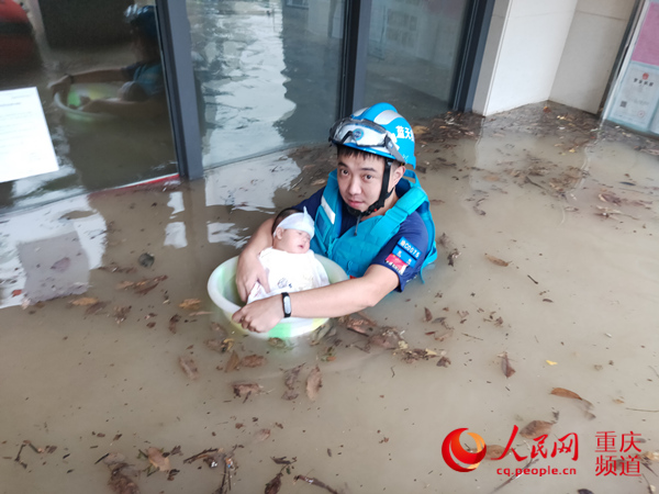 人民網(wǎng)重慶8月19日電(陳琦、黃軍)近日,洪峰過境重慶。8月18日下午,重慶藍天救援隊隊員藍林接到重慶市合川區(qū)龍湖美岸小區(qū)求助電話,救援隊員到達后,發(fā)現(xiàn)小區(qū)一樓大門到樓層樓梯處已進水,要進去必須潛到水下去。藍林進去后與求助者匯合,考慮到有嬰兒,他把嬰兒放進臉盆里,一點點移動,成功把嬰兒救了出來。