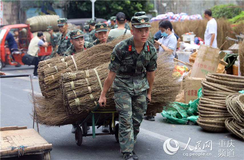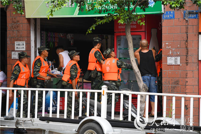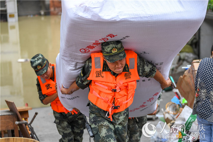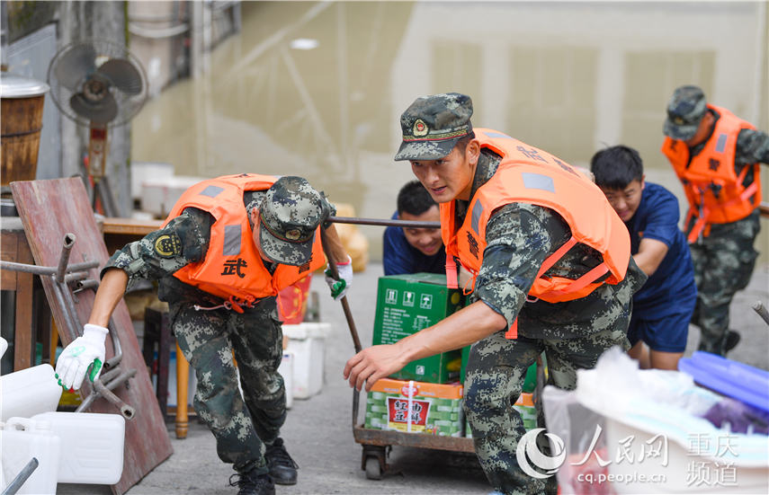 8月18日,在重慶北碚區(qū)水土街道,武警重慶總隊(duì)機(jī)動(dòng)支隊(duì)官兵在幫助群眾搶運(yùn)物資。王肸攝
