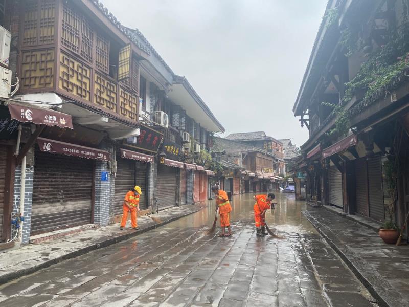 上午8時,磁器口的洪水出現(xiàn)消退。沙坪壩無人員傷亡和重大財產損失,經受住洪峰考驗,環(huán)衛(wèi)工人開始打掃清淤。