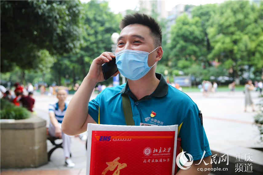 沙坪壩郵政投遞員張雙刃給蘭書悅打電話通知領(lǐng)取錄取通知書。 朱亞坤 攝