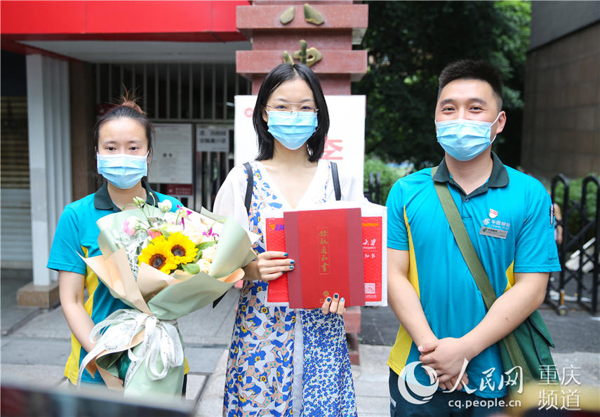 沙坪壩郵政投遞員給蘭書悅送上錄取通知書和鮮花。朱亞坤 攝