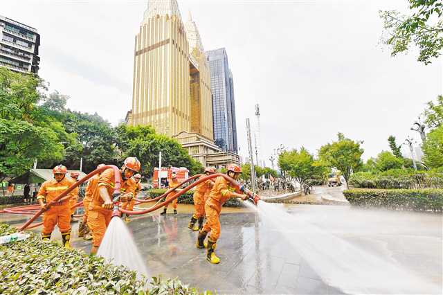 清淤 8月22日,南濱路清淤工作正在緊張進(jìn)行,南岸消防救援支隊(duì)正在對(duì)路面進(jìn)行沖洗。特約攝影 郭旭/視覺重慶