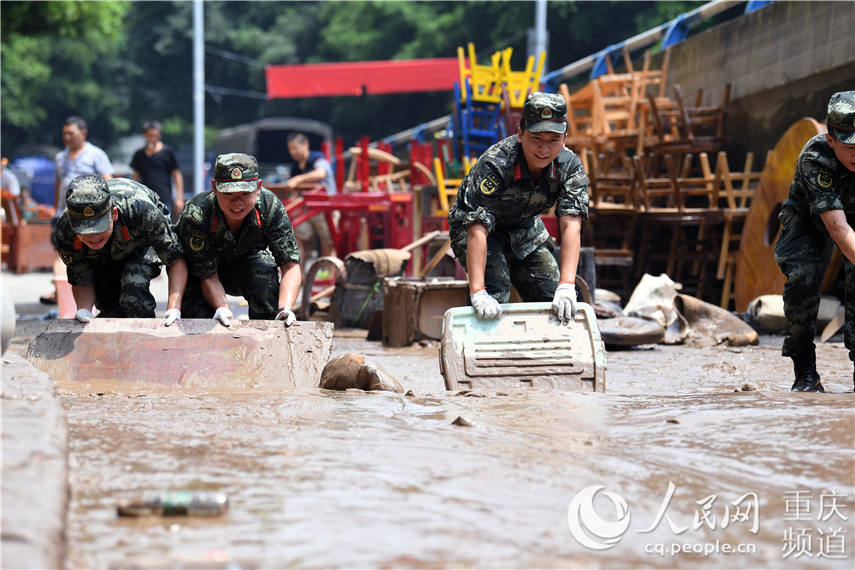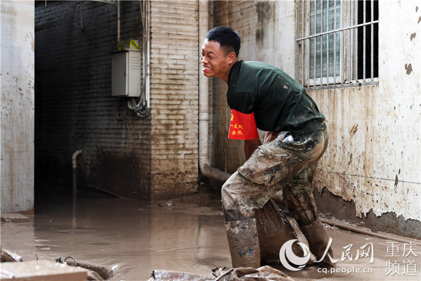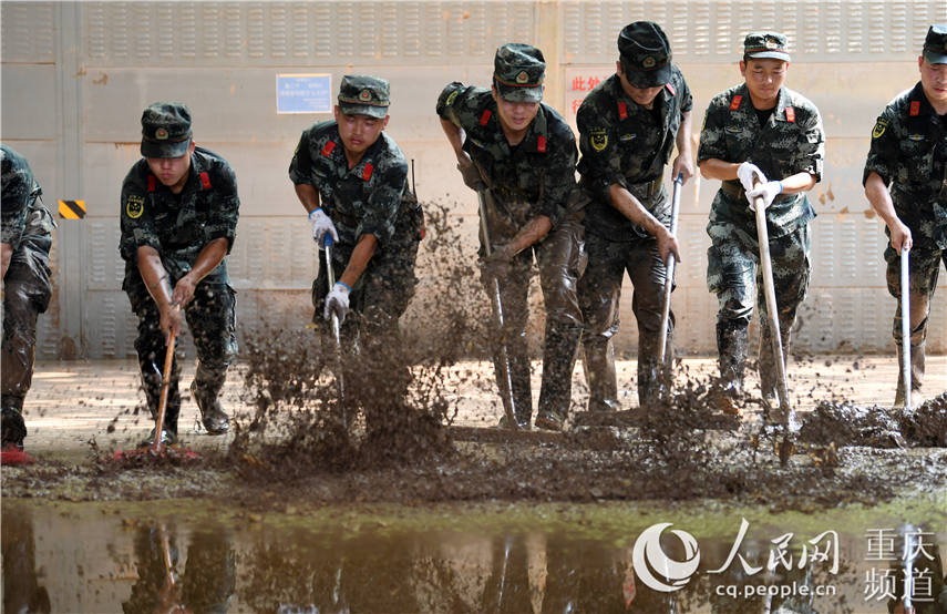 圖為武警重慶市總隊(duì)執(zhí)勤第一支隊(duì)勤務(wù)保障大隊(duì)官兵清淤現(xiàn)場(chǎng)。郭傳伍攝