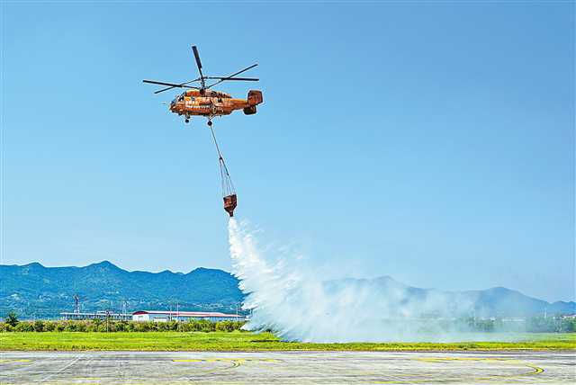 八月二十八日,市應(yīng)急管理局航空救援總隊空勤大隊正在進行直升機吊桶滅火演練。記者 解小溪 攝\視覺重慶