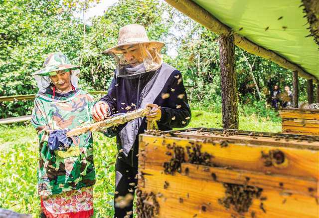 金秋時節(jié),南川山王坪鎮(zhèn)廟壩村迎來了蜂蜜收獲季。村民鄭小林在山林里的蜜蜂園內(nèi),打開一個個蜂箱,收獲著香甜的蜂蜜。甘昊旻 攝