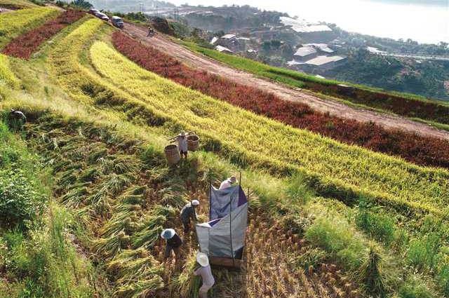 8月28日,大渡口跳磴鎮(zhèn)石盤村彩色稻田,村民在田間收割稻谷。龍在全 攝