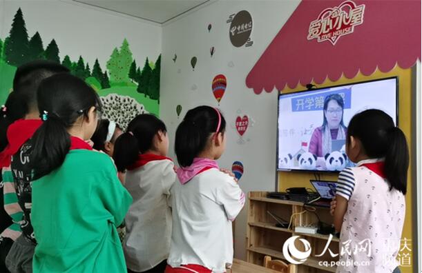 “愛心小屋”位于花竹村校圖書室,內(nèi)有寬帶接入電視,不僅可在小屋內(nèi)組織在線學(xué)習(xí)和互動(dòng)活動(dòng),還能通過(guò)“渝眼APP”讓學(xué)生與外出打工的父母視頻在線交流。