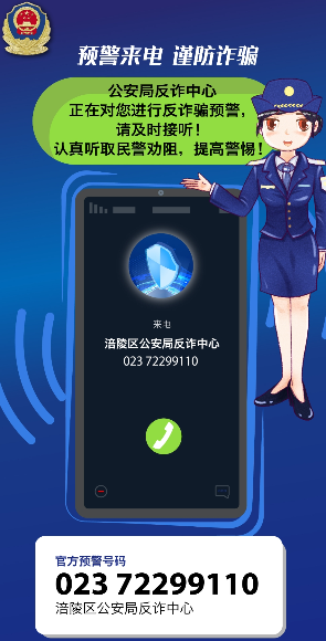 22日,重慶市涪陵區(qū)公安局反詐騙中心開通反詐預警專用號碼“023-72299110”。警方提示市民,當接到 “023-72299110”這個號碼打來的電話,那意味著您正在遭遇電信網(wǎng)絡詐騙或者您屬于易受騙高危人群,請務必及時接聽,耐心聽取勸阻員的勸阻,避免上當受騙。