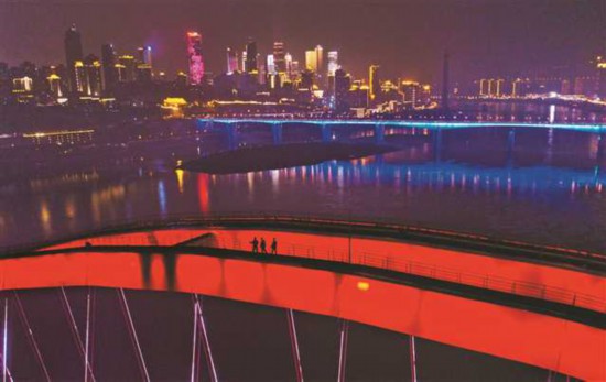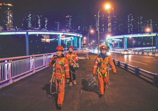 一月十一日晚,美麗的菜園壩大橋猶如彩虹橫跨長江,工人們踏上“彩虹”,前往問題燈飾“問診”。