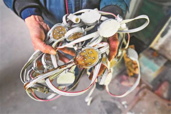 1月12日,重慶大劇院,工人向記者展示換下的燈組。