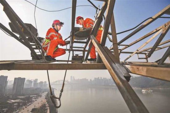 1月11日,菜園壩大橋,工人們攜帶著燈飾維修裝備準備上橋。