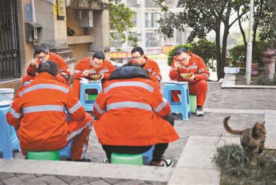 1月13日,南岸區(qū)彈子石,工人們在街頭匆匆用餐,很快又要投入工作。