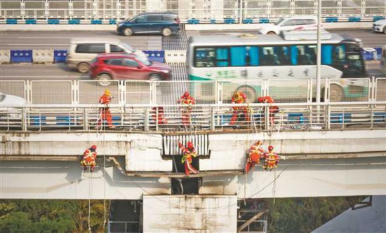 1月11日,鵝公巖大橋,工人們懸掛在橋的一側(cè)作業(yè)。