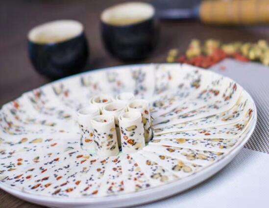合川桃片生產(chǎn)原料主要是糯米、核桃仁等,傳統(tǒng)工藝包括篩選、淘洗、炒米、磨粉、篩粉、回潤、回炒、攪糖、擦粉、燉糕、蒸湯、下錦、切片等十多道工序。桃片成品展卷不斷,潔白如云,入口易溶,既講究色、香、味、形,又營養(yǎng)豐富。